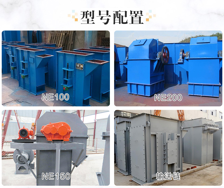 散装物料板链斗式提升机拥有大小不同的11种型号以及不同配置,型号有NE15、NE30、NE50 、NE100、NE150、NE200、NE300、NE400、NE500、NE600、NE800等,不同大小型号的提升机配置(料斗、链条、振动电机)选用的都不同所以价格也会有所不同,提升产量越大所选择的料斗规格与电机功率也就越大。
