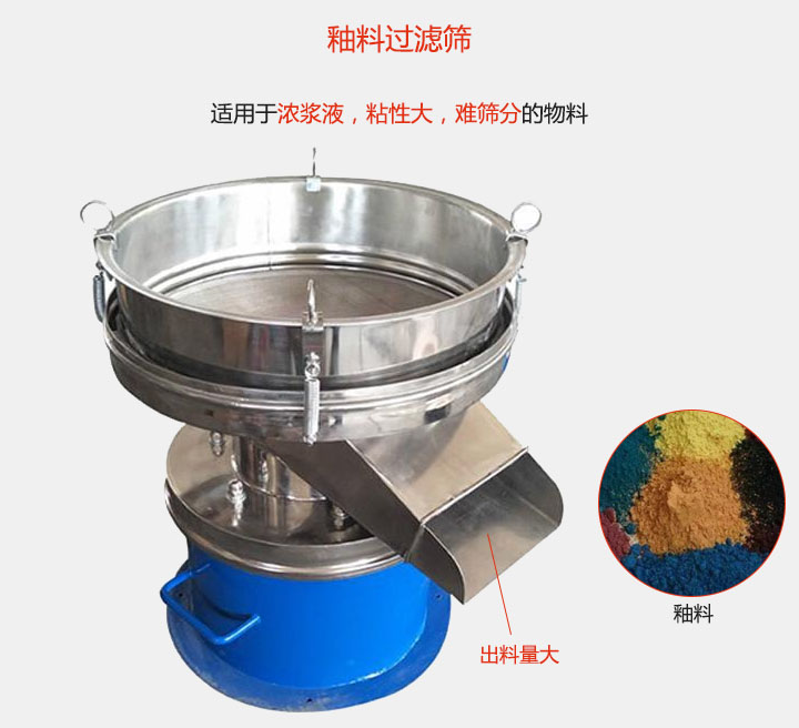 釉料过滤筛有被称之为450过滤筛该产品是根据浓浆液,粘性大,难筛分的物料而设计的高性能,低耗能的浆液专用过滤筛,过滤筛分机。该筛机为单网设计,筛网使用寿命长,出料口设计在振动体上,出料量大。
