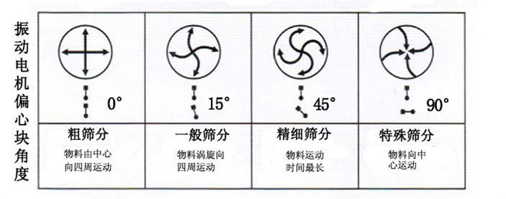 当上下偏心块调至45度时,物料呈快速漩涡状分散,用来筛分精细物料。