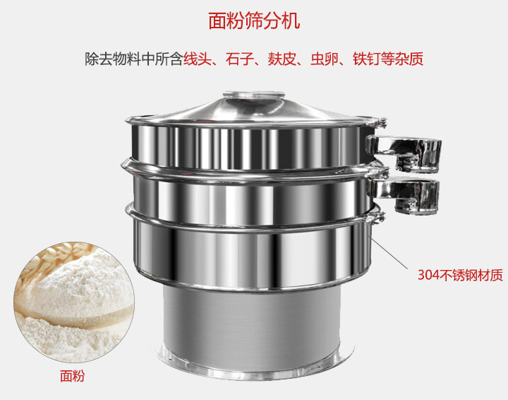 面粉筛分机广泛用于:颗粒染料,面粉,石粉,树脂粉,桃汁,金属粉末 ,钨粉,玉米,碎石粉,石英砂。
